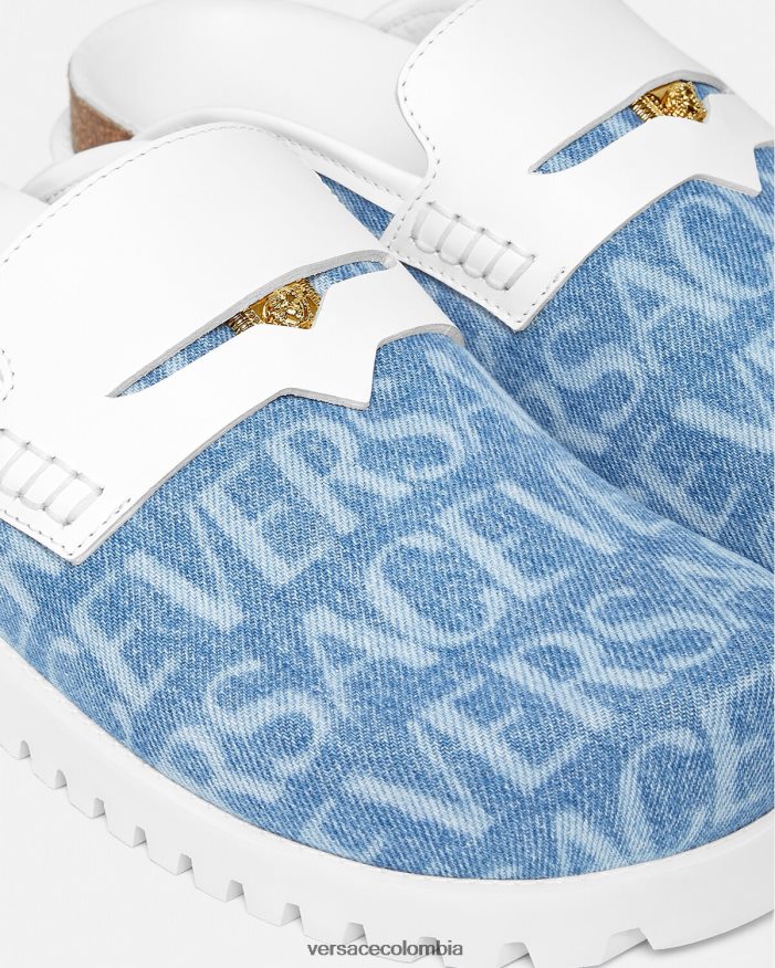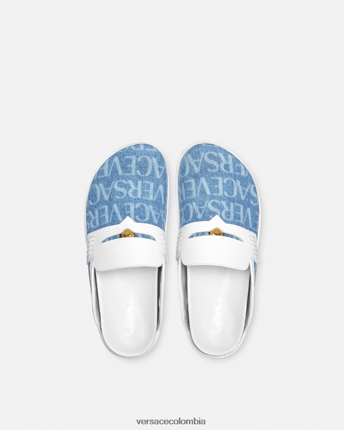 Estas mules sin cordones tienen entresuela de corcho moldeado y suelas de goma para una pisada liviana. Están confeccionados con parte superior de mezclilla con un logotipo de Versace grabado a láser y una tachuela de Medusa decorativa en la parte delantera.