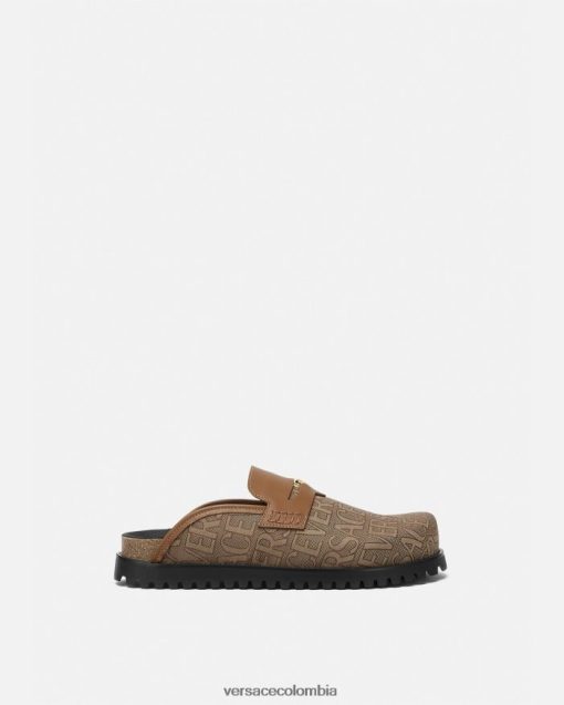 Estas mules sin cordones tienen entresuela de corcho moldeado y suelas de goma para una pisada liviana. Están confeccionados con parte superior de lona jacquard con un logotipo de Versace en toda la prenda y una tachuela de Medusa decorativa en la parte delantera.