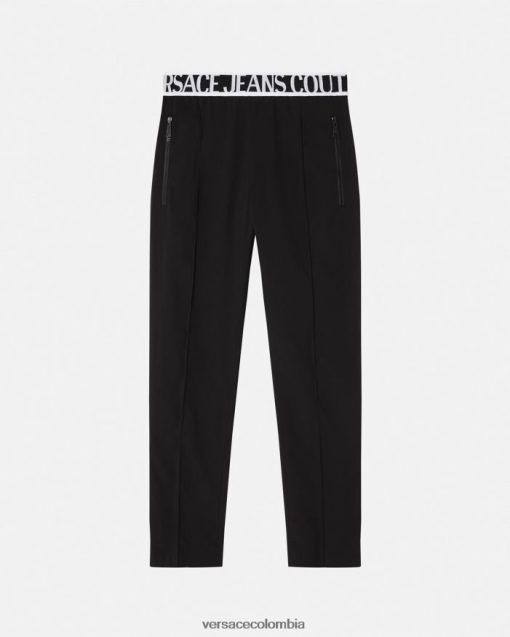 un par de pantalones livianos con el logo de versace jeans couture en la cinturilla elástica, pliegues delanteros, bolsillos con cremallera y un parche de etichetta en la parte trasera.