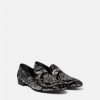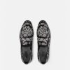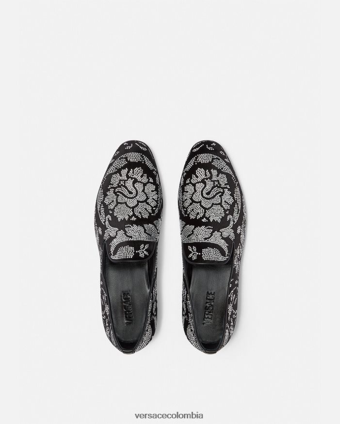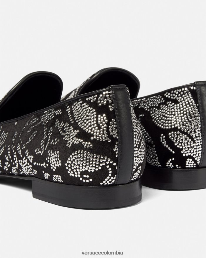 Estas pantuflas de terciopelo tienen tacones planos apilados y presentan un motivo de silueta barroco con tachuelas por toda la prenda.