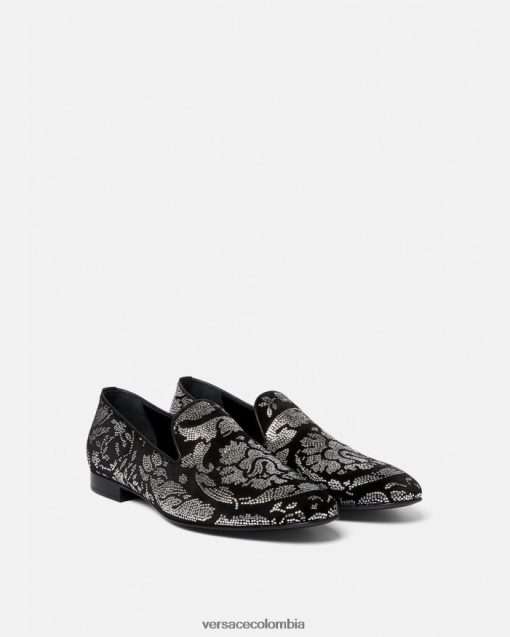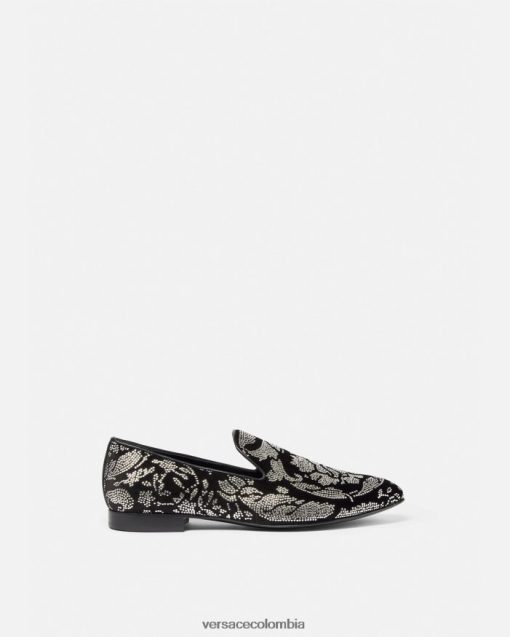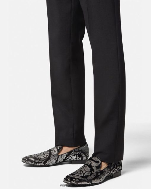Estas pantuflas de terciopelo tienen tacones planos apilados y presentan un motivo de silueta barroco con tachuelas por toda la prenda.
