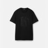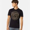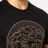 Camiseta de algodón con cuello redondo y un icono de medusa con tachuelas en una mezcla de tachuelas y adornos brillantes.