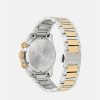 - caja: acero inoxidable y caja ip champagne; anillo superior negro con indicador de minutos y logotipo de versace