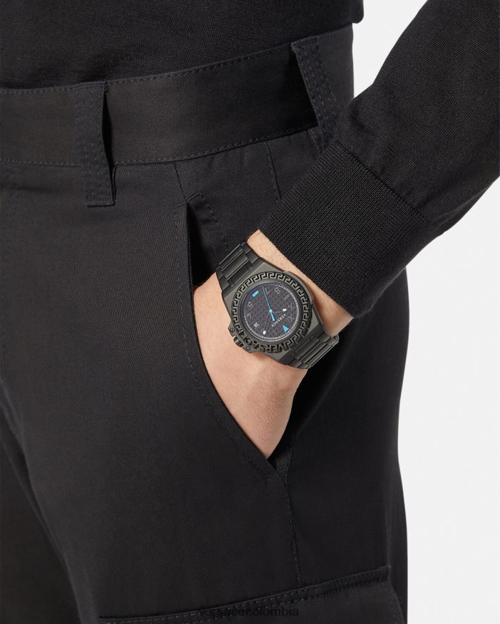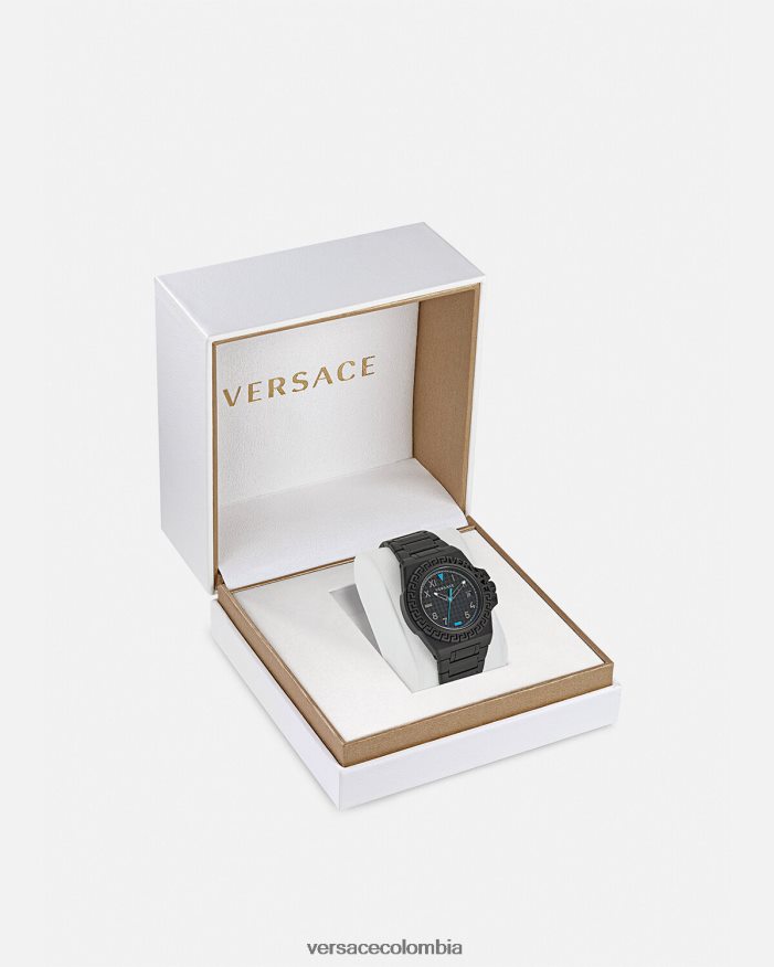 - Caja: redonda de IP negra de 44 mm con diseño de Greca y logotipo de Versace en el anillo