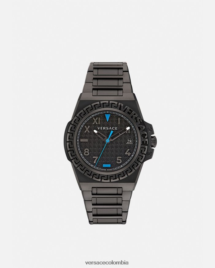 un reloj masculino mate equipado con movimiento cronógrafo y una esfera de tres contadores. el anillo está detallado con un patrón de greca grabado y letras Versace por todas partes, mientras que la esfera presenta una ventana de fecha ubicada a las tres en punto y un motivo de greca tonal en toda la superficie. La banda de metal está rematada con un cierre de mariposa y pulsadores.