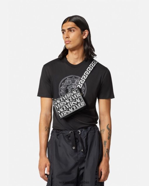 una riñonera compacta confeccionada en lona con el logo de versace estampado por toda la prenda. Este modelo versátil se puede llevar cruzado gracias a la correa ajustable de greca en jacquard y se completa con tres ranuras interiores para tarjetas.