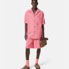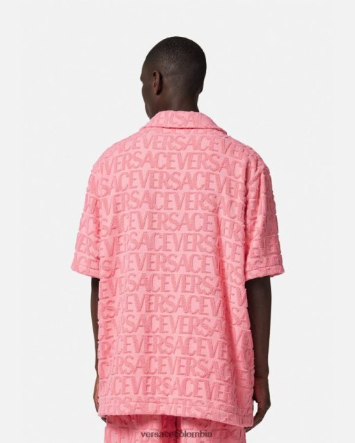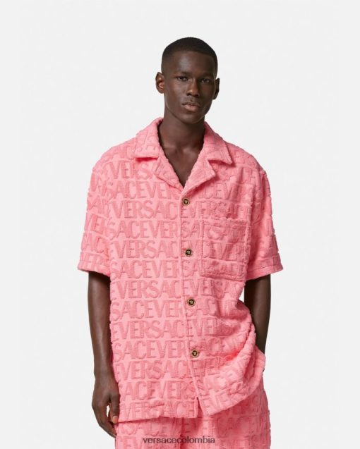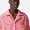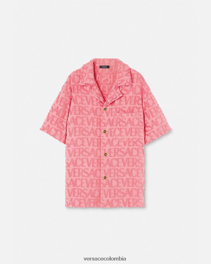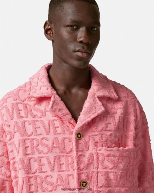 Este estilo de ropa de playa tiene un frente abotonado acentuado por piezas metálicas de medusa esmaltadas y está confeccionado con un material de toalla de rizo texturizado de Versace. La sobrecamisa de manga corta sin forro tiene cuello con muesca y bolsillo en el pecho.