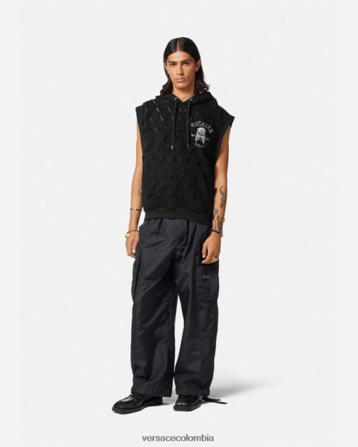 una sudadera con capucha sin mangas hecha de jersey de algodón, con cortes de diamantes y una interpretación a la maschera del logotipo del equipo universitario, un símbolo orgulloso de pertenecer a la familia versace.