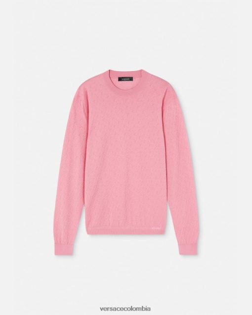 Este suéter de manga larga, confeccionado con una mezcla semitransparente de seda y algodón, presenta un estampado de La Greca tonal en toda su extensión y está rematado con ribetes acanalados.