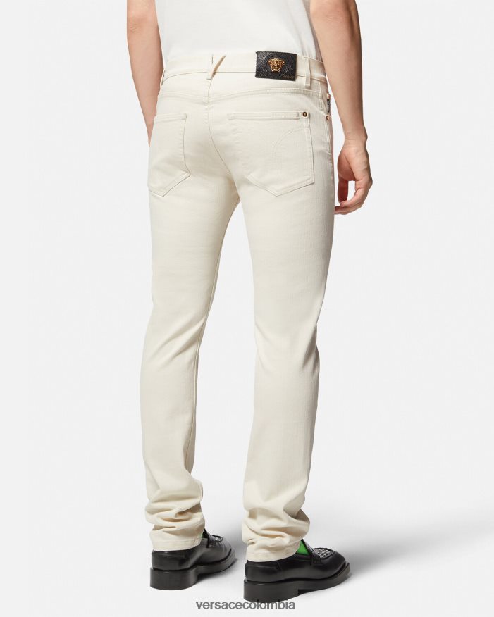 Estos jeans ajustados, confeccionados en denim de algodón elástico, presentan un diseño de cinco bolsillos con una placa de medusa tridimensional en la parte posterior.