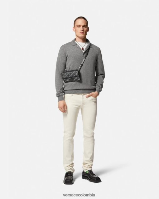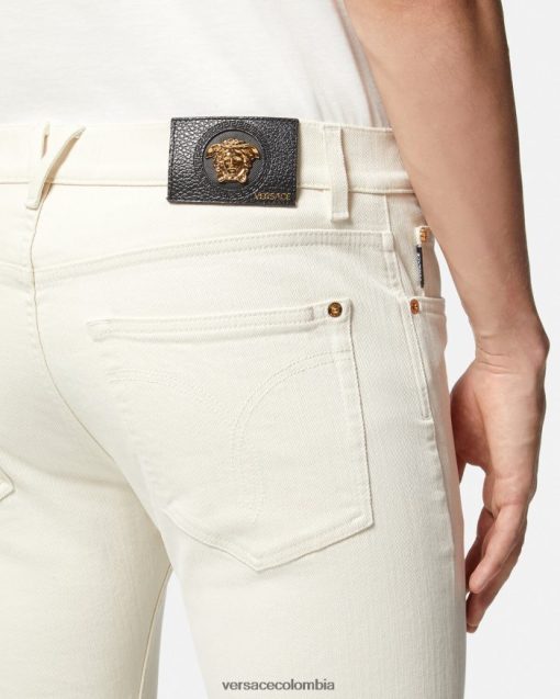 Estos jeans ajustados, confeccionados en denim de algodón elástico, presentan un diseño de cinco bolsillos con una placa de medusa tridimensional en la parte posterior.