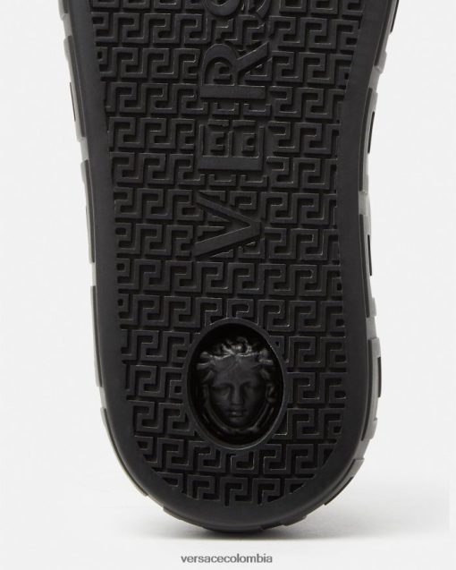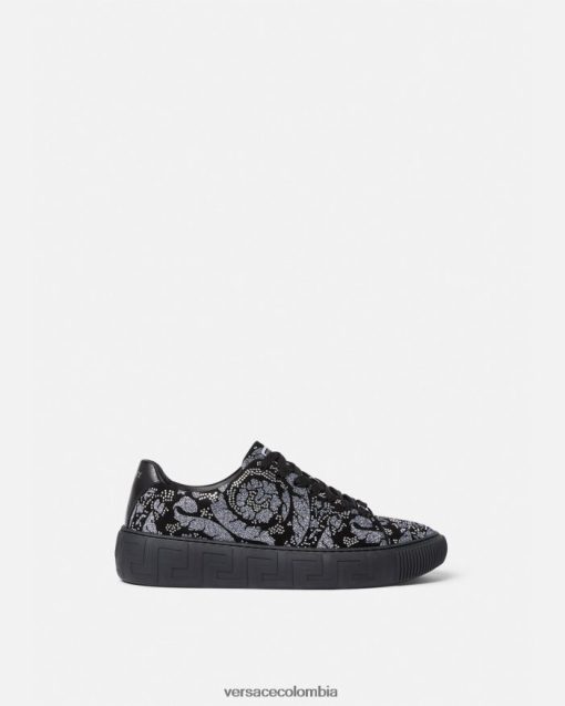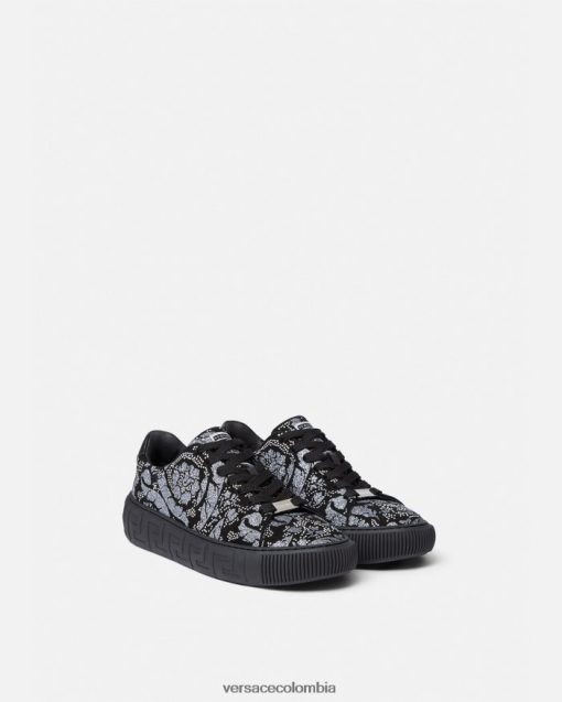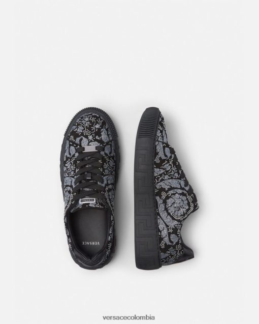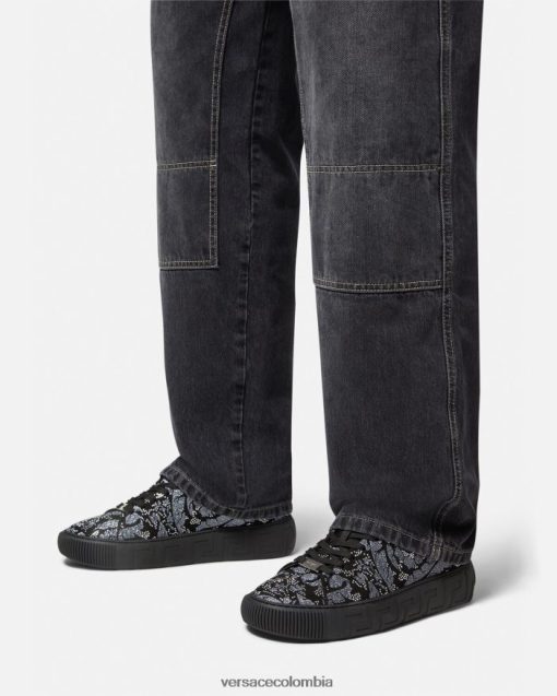 Caracterizada por un patrón de greca grabado sobre suelas de goma vulcanizada, la silueta de caña baja presenta una parte superior de gamuza con un patrón de silueta barroco con tachuelas. un sello con el logotipo en la parte trasera acentúa el estilo con cordones.