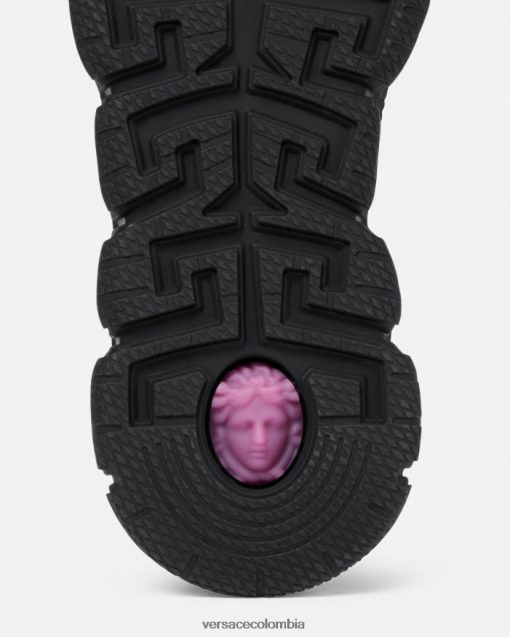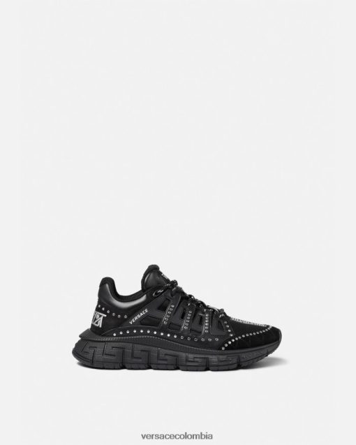 Las zapatillas Trigreca aportan innovación a la estética en constante evolución de la marca. Con un diseño tonal con detalles de tachuelas, las ejecuciones tridimensionales de greca en las suelas ofrecen un aterrizaje impactante con el “sistema de amortiguación greca”. En un sutil guiño a la ciudad natal de Versace, la parte superior tiene una discreta impresión de las coordenadas de Milán.