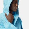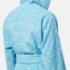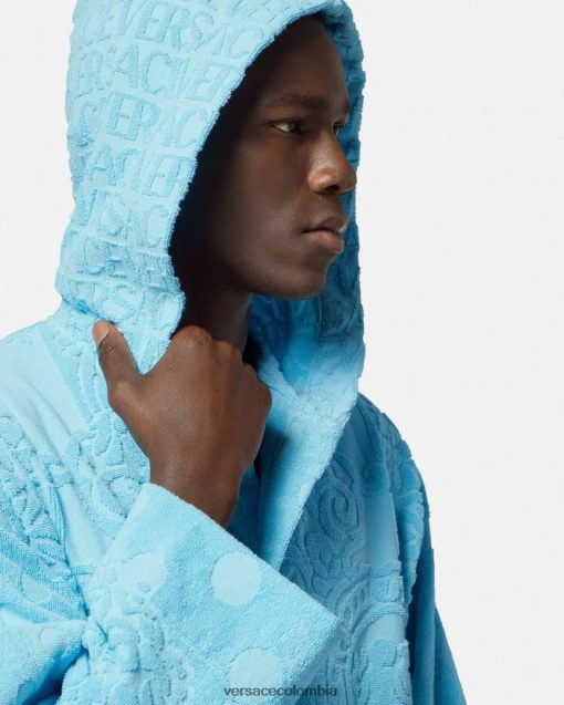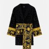 Este albornoz corto está confeccionado con una suave toalla de felpa con un motivo de lunares barrocos de conchas marinas en el mismo tono y una capucha. El diseño se detalla con un patrón integral de Versace tonal en el reverso y en el cinturón anudado.