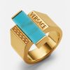 un anillo de banda ancha con letras Greca y Versace grabadas y una piedra preciosa turquesa rectangular central. Todos los productos de joyería de Versace no contienen plomo ni níquel. Todos los materiales son hipoalergénicos.
