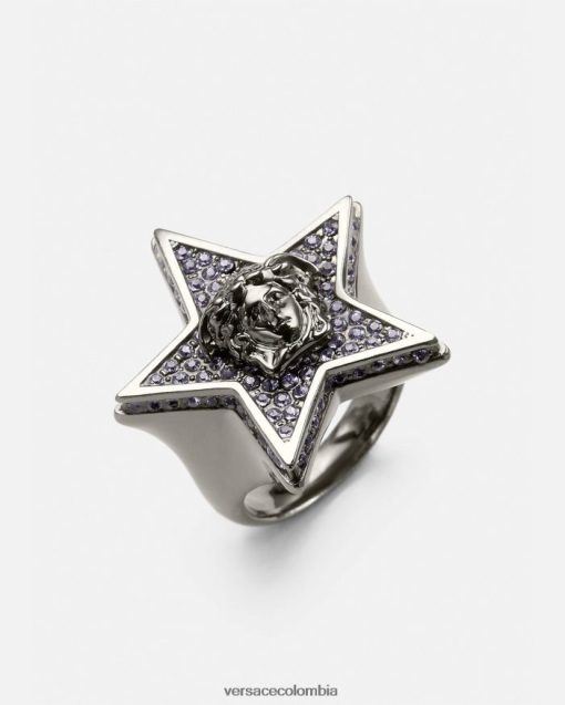 un anillo en forma de estrella con adornos de cristal y un charm central de medusa. El logotipo de Versace y la talla están grabados en el anillo interior. Todos los productos de joyería de Versace no contienen plomo ni níquel. Todos los materiales son hipoalergénicos.