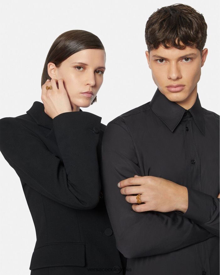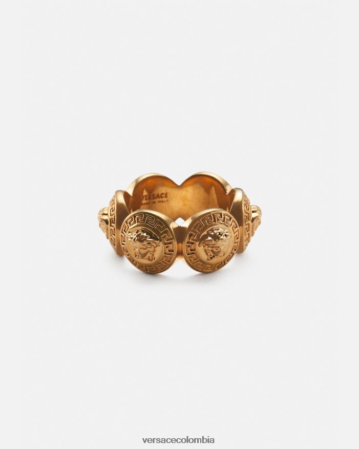 Detalles de medallón de Medusa en un llamativo anillo de metal. esta pieza tiene una calidad de color con efecto vintage. Todos los productos de joyería de Versace no contienen plomo ni níquel. Todos los materiales son hipoalergénicos.