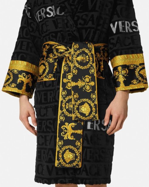 Esta bata de baño larga, confeccionada en algodón, presenta un estampado integral tonal de Versace con un logotipo adornado con cristales, mangas con el característico estampado barroco y un cinturón cruzado.