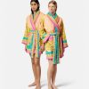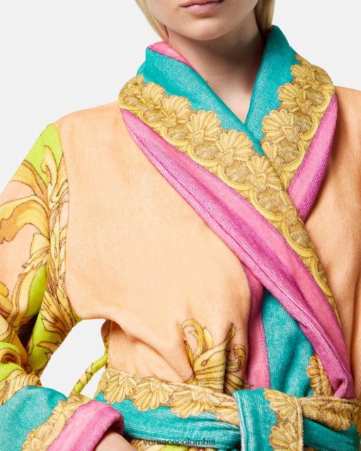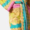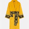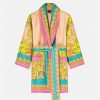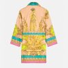 un albornoz corto y suave de felpa con estampado de la diosa barroca y cinturón anudado.