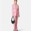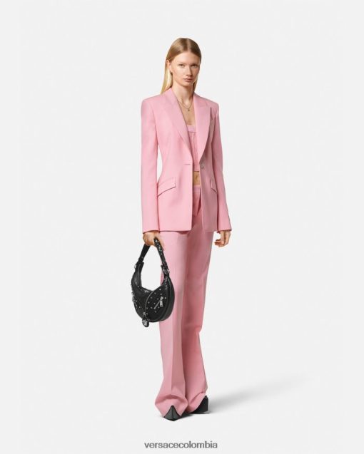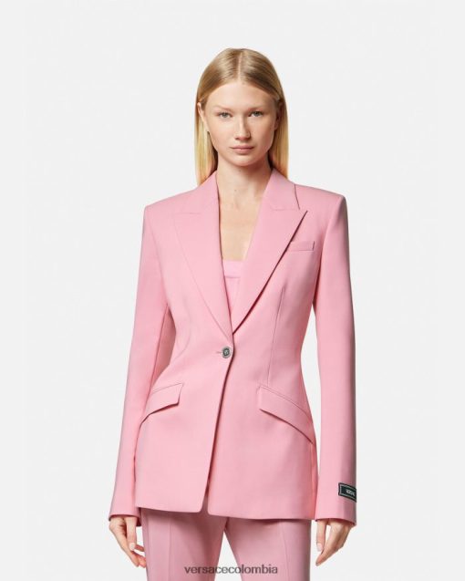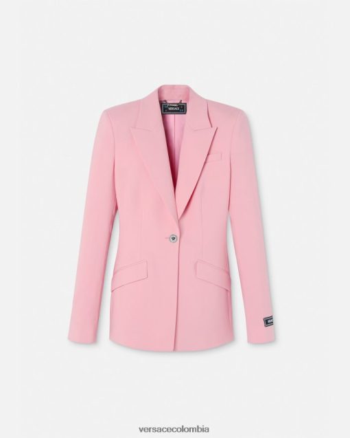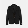 Hombros afilados y entallados aparecen en este blazer de botonadura sencilla con bolsillos laterales angulares, solapa de muesca y un solo botón Medusa.