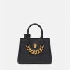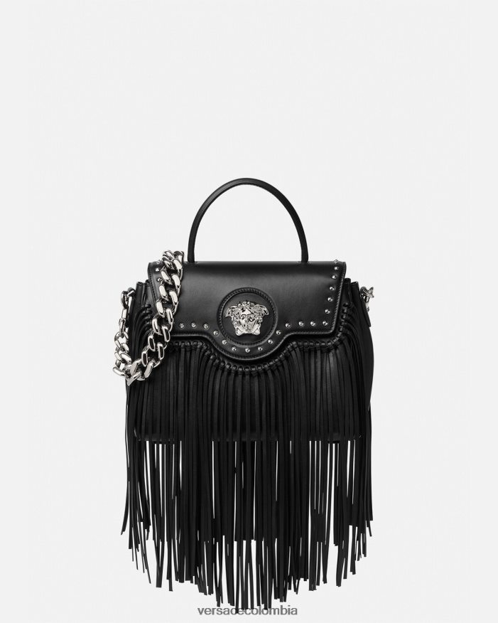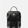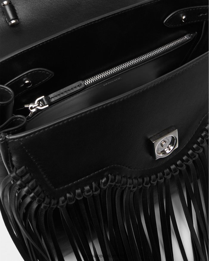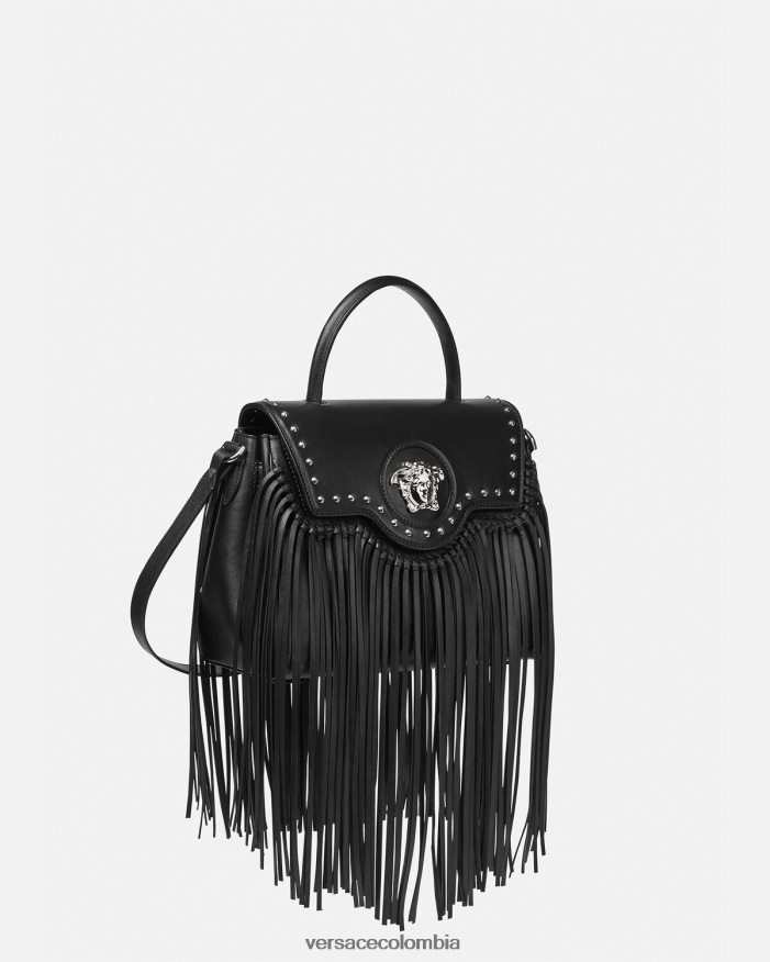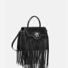 Elaborado en cuero granulado con una silueta estructurada, el bolso exclusivo está adornado con una placa de Medusa en la parte delantera y está revisado con flecos de cuero en cascada. Este estilo versátil se puede llevar en la mano o cruzado usando la cadena intercambiable y las correas de cuero para los hombros.