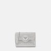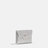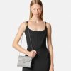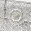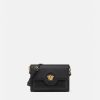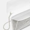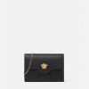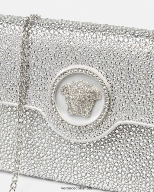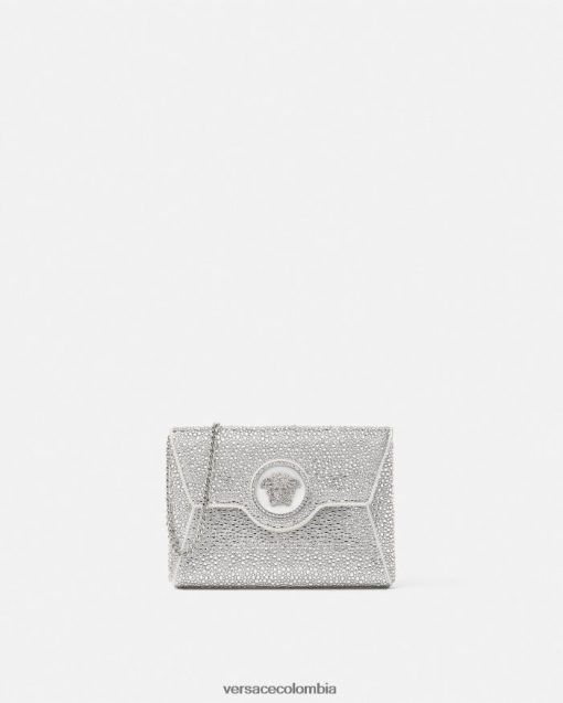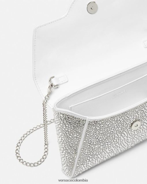 Este bolso de mano tipo sobre, confeccionado en cuero, está adornado con adornos de cristal en el mismo tono y una placa de medusa en la parte delantera. La correa de cadena desmontable permite llevar este accesorio de noche fácilmente en la mano.