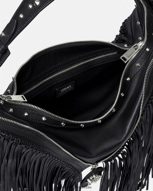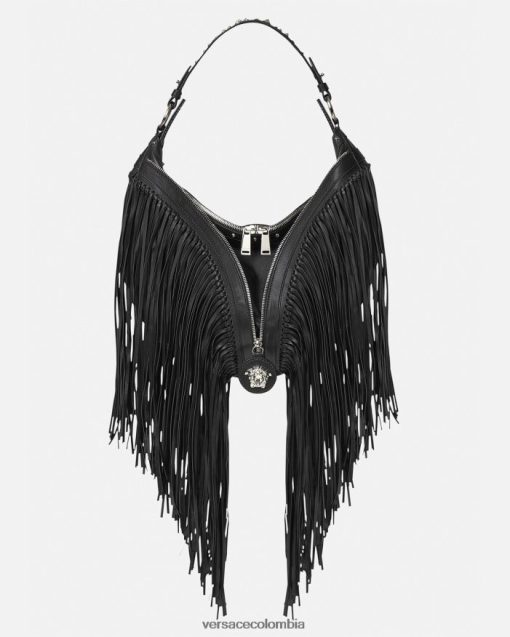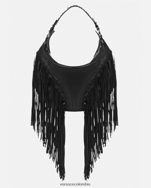 Una versión inspirada en los moteros del bolso de hombro repetido confeccionado en cuero italiano flexible con una correa para el hombro desmontable. un tirador con dije de medusa y flecos en cascada anudados a mano añaden una actitud grunge con un toque versace.