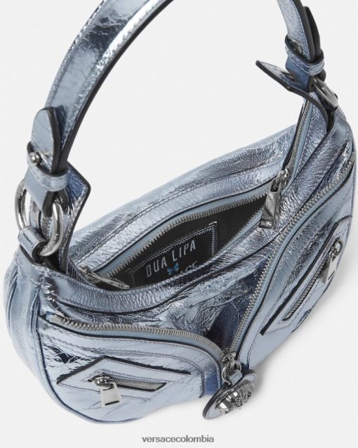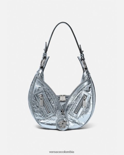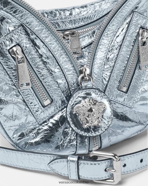 El bolso de hombro repetido, una reedición de una silueta hobo de archivo, está confeccionado en cuero metalizado con efecto craquelado. De inspiración motera, un tirador con dije de medusa y cremalleras diagonales añaden una actitud grunge con un toque versace.