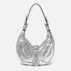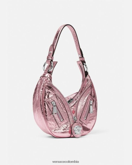 El bolso de hombro repetido, una reedición de una silueta hobo de archivo, está confeccionado en cuero metalizado con efecto craquelado. De inspiración motera, un tirador con dije de medusa y cremalleras diagonales añaden una actitud grunge con un toque versace.