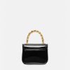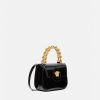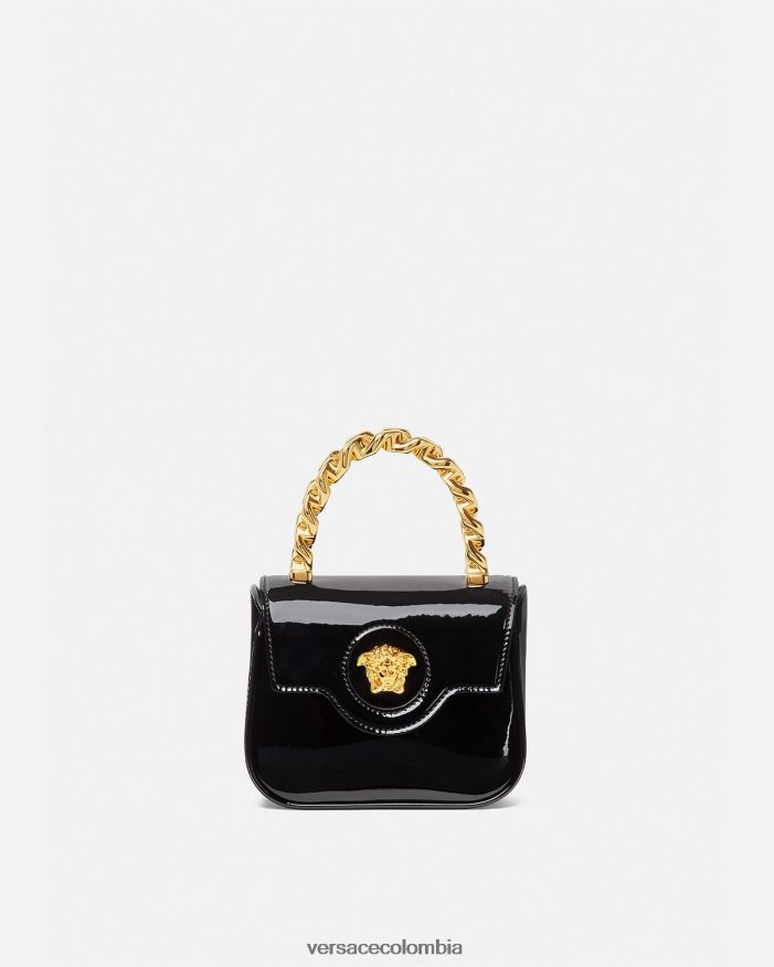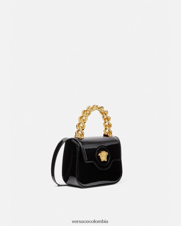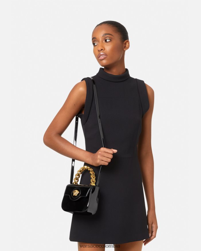 Elaborado en Italia con cuero brillante, este diseño presenta un asa superior de cadena rígida. Está adornado con una medusa central en tono dorado y cuenta con una correa para el hombro ajustable.