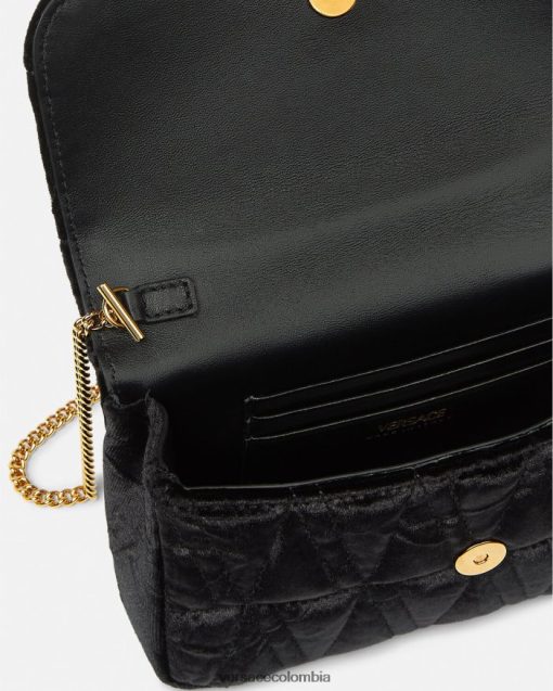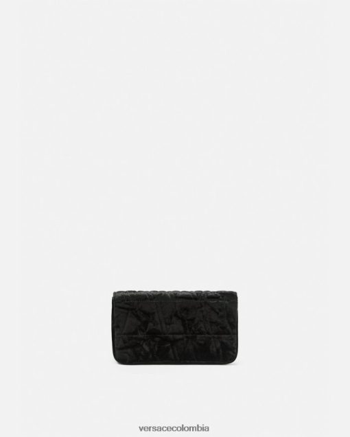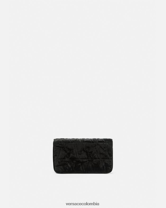 Confeccionado en terciopelo de textura suave con un patrón de V acolchado, el mini bolso Virtus presenta una V barroca con detalles de hojas de acanto grabadas y un cierre de solapa magnético. El pequeño bolso de noche se completa con una correa de cadena para el hombro y ranuras internas para tarjetas.