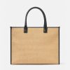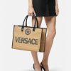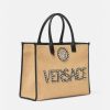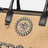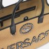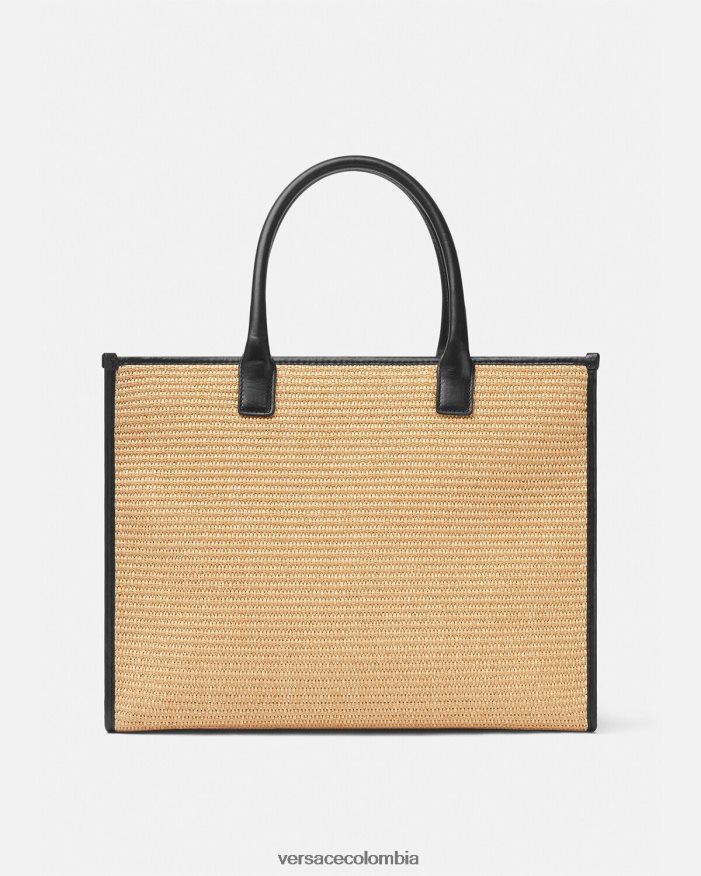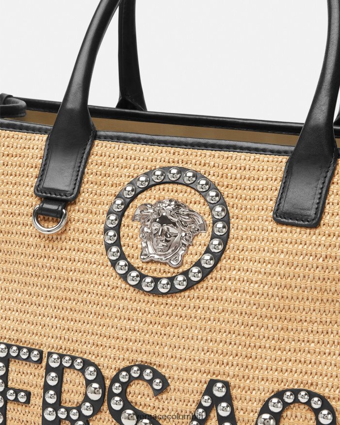 Este bolso tote está confeccionado en rafia con ribetes y tachuelas de cuero. el diseño está adornado con el detalle de la medusa y el logo de versace. el espacioso interior está organizado con dos bolsillos con cremallera y cierre de botón a presión.