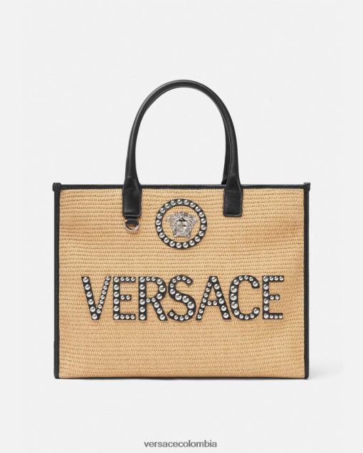 Este bolso tote está confeccionado en rafia con ribetes y tachuelas de cuero. el diseño está adornado con el detalle de la medusa y el logo de versace. el espacioso interior está organizado con dos bolsillos con cremallera y cierre de botón a presión.