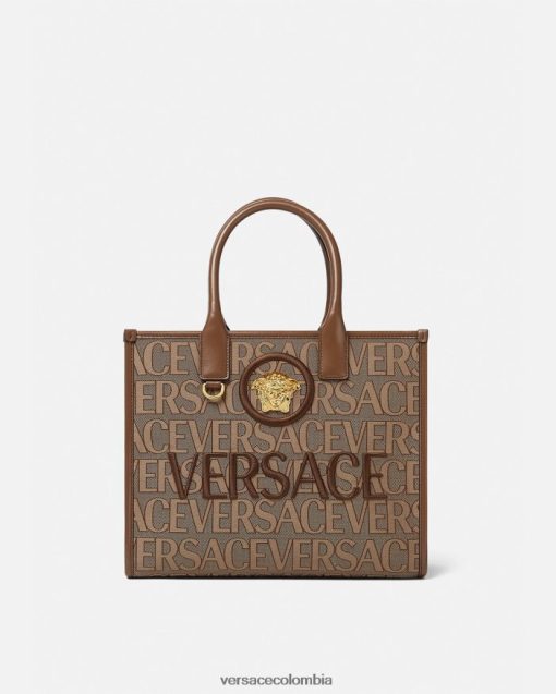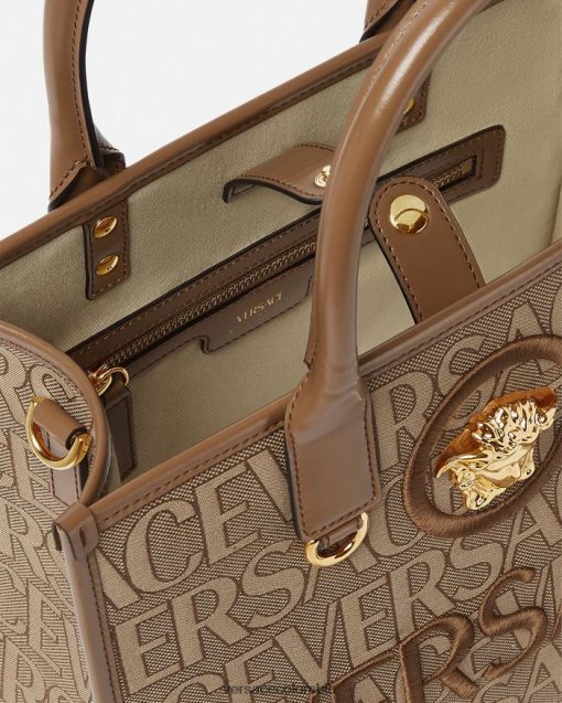 Este bolso tote está confeccionado con un patrón jacquard integral de lona de Versace y cuenta con una correa para el hombro ajustable y desmontable y adornos de cuero. El diseño está adornado con piezas metálicas de la Medusa y un logotipo de Versace bordado. El espacioso interior está organizado con un bolsillo con cremallera y cierre de botón a presión.