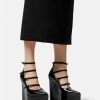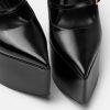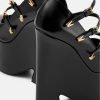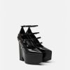 Estos llamativos zapatos de tacón en punta de Versace se definen por un tacón de plataforma con muescas en forma de onda. Los herrajes en forma de V en las correas de las hebillas acentúan la parte superior de cuero.