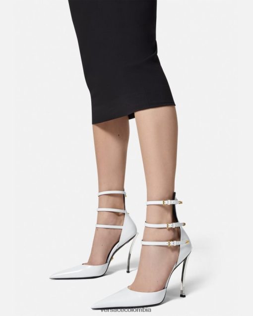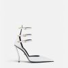 Caracterizados por tacones de aguja altos y curvos, estos zapatos de tacón de cuero cuentan con puntera puntiaguda y correas con doble hebilla en la parte delantera. están acentuados por herrajes en forma de V.