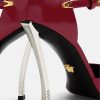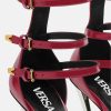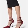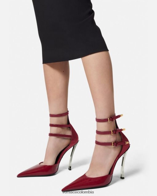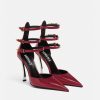 Caracterizados por tacones de aguja altos y curvos, estos zapatos de tacón de cuero cuentan con puntera puntiaguda y correas con doble hebilla en la parte delantera. están acentuados por herrajes en forma de V.