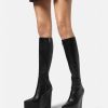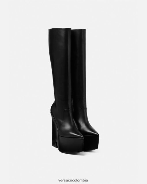 Estas llamativas botas de cuero puntiagudas hasta la rodilla de Versace se definen por un tacón de plataforma con muescas en forma de onda.