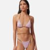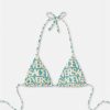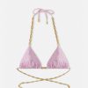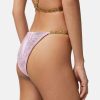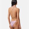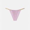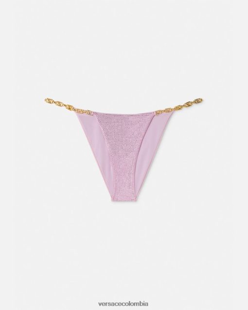versace presenta dua lipa x versace, una colección cápsula codiseñada con dua lipa. Estas braguitas de bikini cuentan con adornos de cristal tonales y una cadena de greca a los lados y detalles fruncidos en la parte posterior. El estilo de traje de baño se puede combinar con el top de bikini a juego.