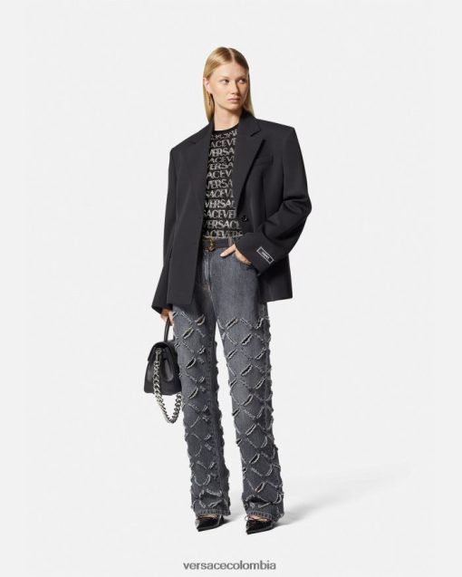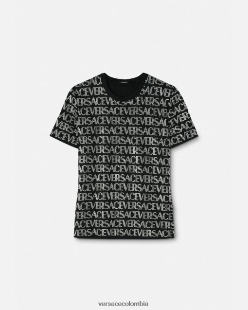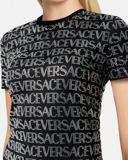 Confeccionada con punto de algodón, esta camiseta de manga corta presenta un motivo del logo de Versace adornado con cristales en toda la prenda.
