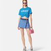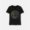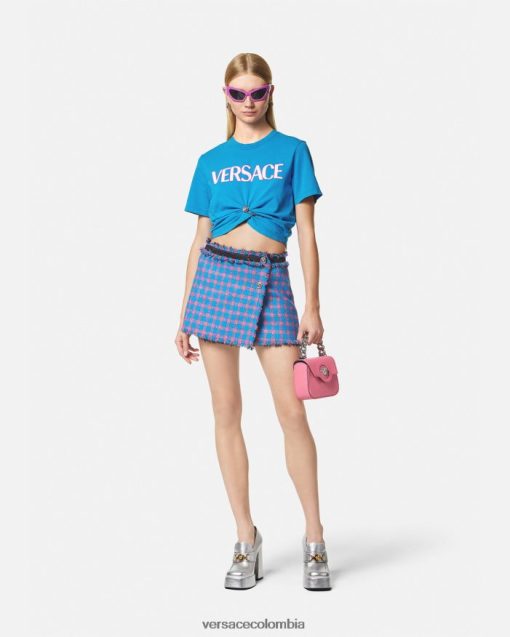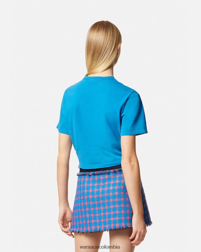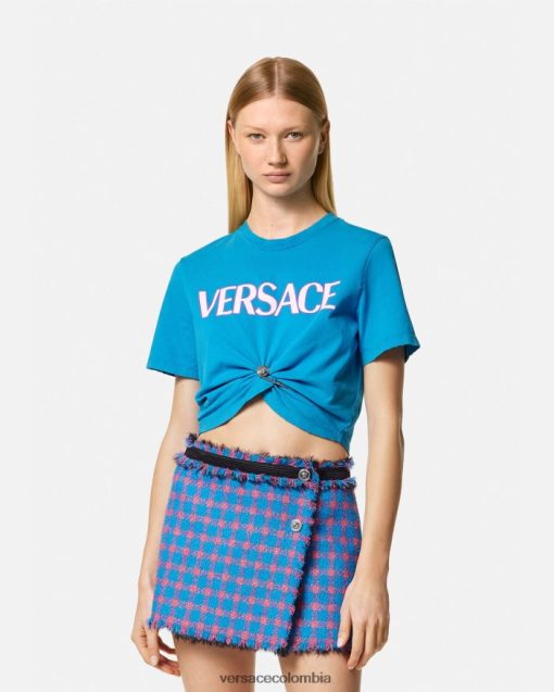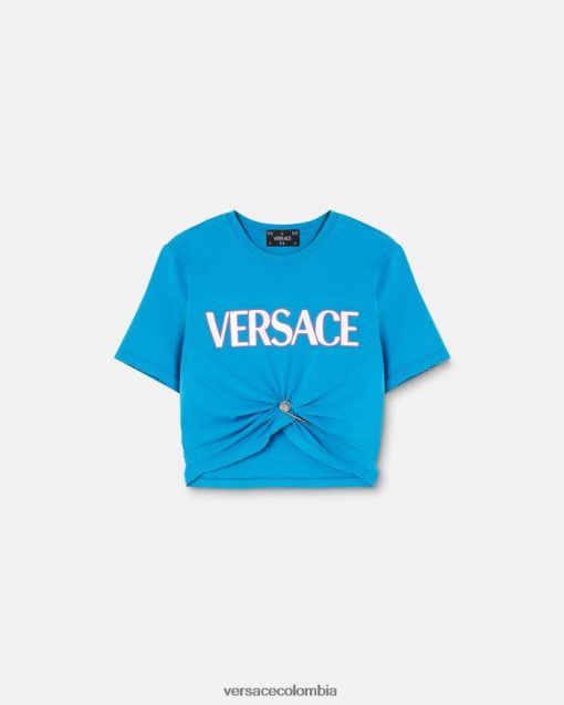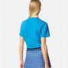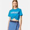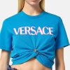 Esta camiseta corta de manga corta presenta el logo de Versace en el pecho con un acabado de goma. el estilo tiene un dobladillo fruncido y un llamativo imperdible.