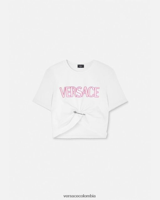 Esta camiseta corta de manga corta presenta el logo de Versace en el pecho con un acabado de goma. el estilo tiene un dobladillo fruncido y un llamativo imperdible.