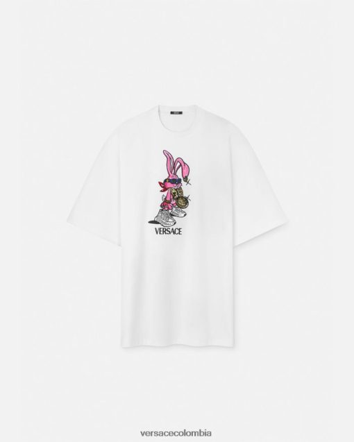 Celebrando el año del conejo, esta camiseta extragrande de algodón presenta un conejito biggie bordado y con lentejuelas que lleva gafas de sol medusa biggie, una cadena de medusa y trigrecas.