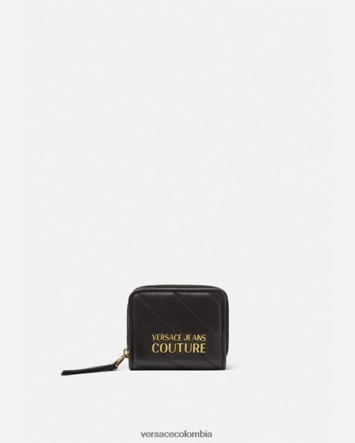una cartera compacta con cremallera de piel sintética y letras del logo en la parte delantera.