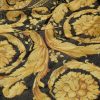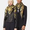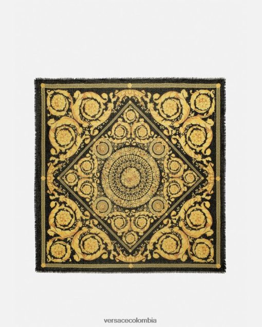 Confeccionado en mezcla de lana, este chal presenta el característico estampado barroco enriquecido con hilos metálicos y un borde ligeramente con flecos.