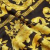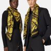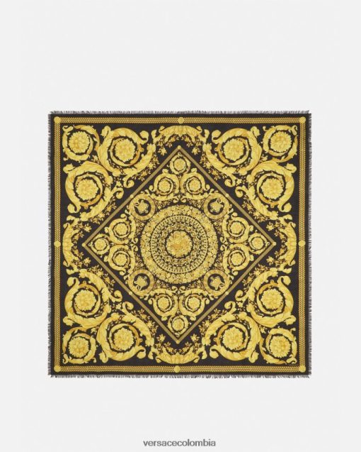 Este chal, confeccionado en una mezcla de lana, seda y cachemir, presenta el característico estampado barroco y un borde con flecos. un sello distintivo de la marca, que representa patrones arquitectónicos barrocos y hojas de acanto.