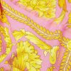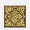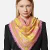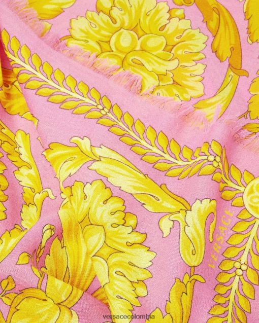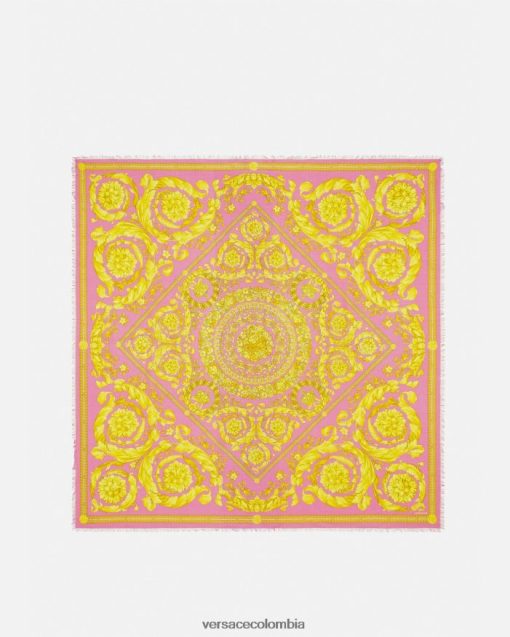 Este chal, confeccionado en una mezcla de lana, seda y cachemir, presenta el característico estampado barroco y un borde con flecos. un sello distintivo de la marca, que representa patrones arquitectónicos barrocos y hojas de acanto.