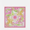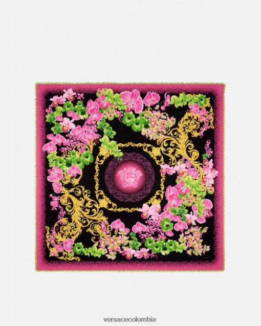 Confeccionado con una mezcla de seda, lana y cachemir, este chal presenta el estampado de orquídeas medusa, el emblema característico de Versace, rodeado de motivos florales.