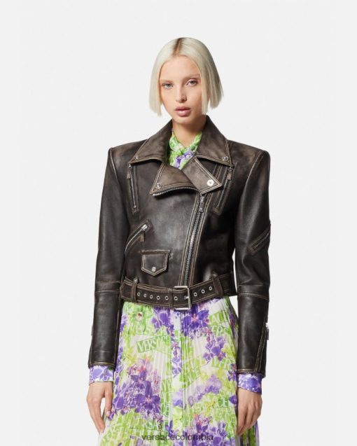 Confeccionada íntegramente en cuero con un acabado cepillado de estilo vintage, esta chaqueta tiene una cremallera diagonal y una cintura con cinturón ajustable. Los detalles metálicos de Medusa y el cálido forro barroco acolchado acentúan el estilo motero.