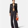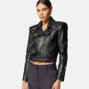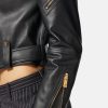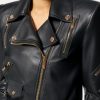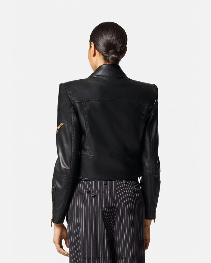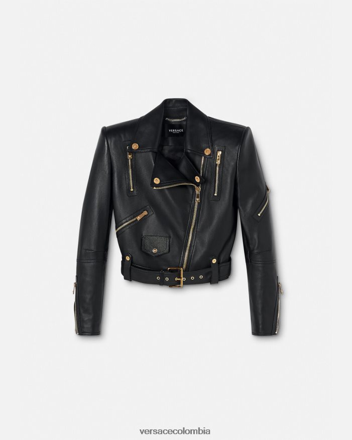 Confeccionada íntegramente en cuero con un acabado de grano suave, esta chaqueta corta de inspiración motera tiene una cremallera diagonal, cinturón en la cintura y está realzada con detalles metálicos de Medusa y bolsillos decorativos con cremallera.